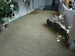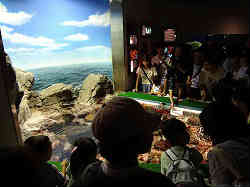 上記にも述べていますが、右の水槽から回り込んで人工の浜辺へと繋がっています。繁殖されたカメがこの砂浜で卵を産みそれを取り出して、別の小さな保育器の水槽みたいな所へ移しふ化させています。その実際の様子(卵は見えないが)の水槽?(砂槽)も展示しています。 | ![]() |