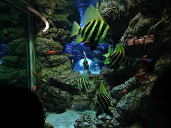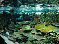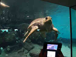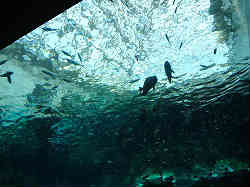 | ここもスケールがデカイのだが、上に水槽があるコーナーで長さ5m以上でしょうか。浅瀬から深みになる状態で上を見上げながら進んでいきます。今までにも上を見ながらのトンネル状の水槽はありましたが、ここは部屋全体がこうなっています。ここの水槽は上(水面上)、中(水中)、下(下から見上げる)と3カ所から見ることが出来ます。 | ![]() |