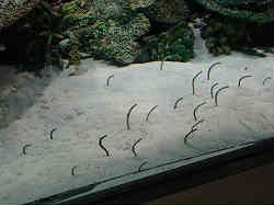 | これは「すみだ水族館」でもあったチンアナゴです。細いアナゴが砂の中に潜っていて上半身を出しゆらゆらエサを待っています。 | ![]() |