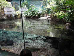 | 北館に入るとすぐに大きな水槽が見えます。よく観察するとショーの水槽(というか巨大なプール)の中腹にあたる。ようするにまだ上と下があるのだ。ここではイルカショーのイルカ君が優雅に泳いでいる(シャチが居たらしいが今は居ない)姿が見える。フロアーも広く冷房もよく効いている。 | ![]() |