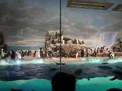 ここのペンギンの売りは皇帝ペンギン(日本ではこことあと一カ所のみ)で何やらマイナス2度の室温と6度の海水温を保っているとかです。南極をイメージした作りでここでもショーがあるらしいです。水槽の中では内側のアクリル壁を掃除している係員の写真です。さすがに綺麗でした。 | ![]() |