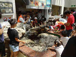 ここも触れ合いの水槽コーナーがあります。前回の竹島水族館よりも綺麗でスケールが全然違います。後ろの海は作り物です。色々な魚(魚ではなくヒトデやウニ・貝など)を触ることができます。そしてここの水族館はエスカレータで3階へと行くぐらい縦のスケールも大きいのです。 | ![]() |