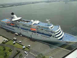 右の赤い船は南極観測船「ふじ」を展示しています。もちろん後の説明でもあるように中へ入れます。手前には海上警察の船も見えています。その横の白とブルーの船はたまたま入港(接岸)してきたパシフィッククイーン号で四国阿波踊りまで乗客を乗せるとアナウンスしていました。全長130mを超えるらしいです。 | ![]() |