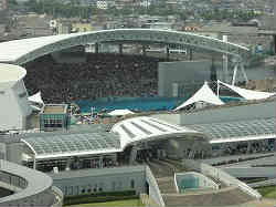 周辺4施設の内のひとつで展望台へ登り港を眺めます。右写真は先ほどの水族館のショーの会場が遠くに見えています。真ん中辺の青いものがプールで上には大きな屋根が見えます。手前は入り口です。左の写真は観測船ふじと連絡橋や水族館が見えています。 | ![]() |
