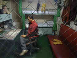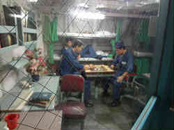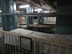 南極観測船ふじの内部です。下も含めて人間が見えていますが、すべて人形です。一瞬ぎょっとしますね。左写真はベットで鎖で吊るしていますが、波に揺れても良いようにちょうどゆりかごのようになります。 | ![]() |
