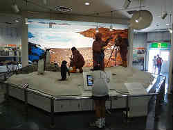 右写真は執務室で上は団らんの部屋です。左は一番上に展示してある南極の風景のセットで他に雪上車や雪上バイクなどがありました。もちろんタローやジローの犬形もあります。 | ![]() |