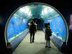 入場券を買い中に入ると「魚の通り抜けアクアゲート」でお出迎えして頂き、次に長いエレベータで8階まで一気にいきます。 水中トンネルはもはや水族館の定番となりましたね。 | ![]() |