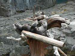 最初は「日本の海」と題したコーナーでカワウソが遊んでいます。木の上に昇って戯れています。左の写真は「モンタレー湾」のアザラシです。ここの見せ方は上階から大きな水槽を細かく区切り、それを下に降りていって縦に距離を稼ぎそれぞれ見せるという手法ですが、ひとつの水槽を2方向や3方向から見せてたくさんあるように錯覚させているのではと思わせられます。しかしある意味演出では有りかなと思われますが、手法はこれのみの連続です。 | ![]() |