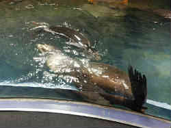 | ここはイルカコーナーで係員がスュキューバダイビングで底をゴシゴシ掃除しています。その垢?をイルカたちが食べていると?(または戯れている?)考えます。 | ![]() |