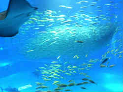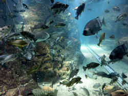 ここはグレートバリアリーフと言ってカラフルな魚たちがたくさん泳いでいます。 ここの唯一の欠点は水が綺麗で無いと言うことです。施設は綺麗のですが、肝心の海水やガラス(アクリル)板が普通の水族館と同じです。今思い出しても「名古屋港水族館」はピカイチでした。 | ![]() |