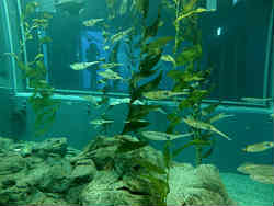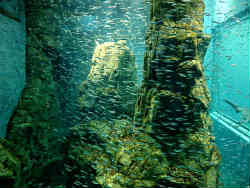 | ここはもうひとつのイワシの群れで「チリの岩礁地帯」コーナーです。岩礁の周りをイワシの群れが泳いでいます。パンフレットでは銀色のカーテンということです。 | ![]() |