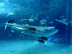 | 海遊館の目玉である大きな水槽「太平洋」コーナーのジンベエザメです。以前はもっと大きな物が居たと思いますが小さくなっています?。メインはここみたいで、上から横から下からと見られます。大きな水槽を網で区切り色々な方向から見せていっています。 | ![]() |