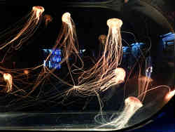 | ふあふあクラゲ館でのクラゲでナイター照明になってその怪しげな光が浮き立っています。これ以外にも定番のミズクラゲとかありました。 | ![]() |