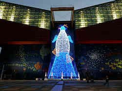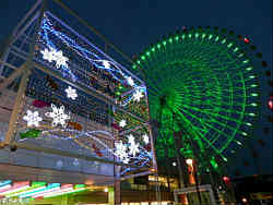 結局はここ海遊館は噂通りで出てみれば、ひとつの大きな縦長の水槽を細かく区切り、上から順次見てきた感じです。イベントやショーなど無く、係員を見たのは水槽の掃除をしている方程度です。やはり展示館という要素が大きく、スペースがあまりないので、なかなか触れ合いコーナーやショーなどもなく前評判の割には今イチだったという印象はぬぐえません。最後は出てみるとすっかり陽が落ちていて大きなクリスマスツリー?のイルミネーションです。その隣には世界最大級の観覧車がこれまたイルミネーションで鮮やかに壮大に回っていました。 | ![]() |