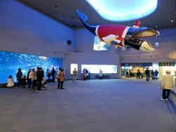 右側が入り口です。券を買い2階へと出向いた場所に入り口はあります。ここも以前に妻と来たことがあります。入ってすぐ綺麗で大きな空間に水槽があります。吊ってある鯨はクリスマスの飾りがしてあります。ここの入場料2400円は今までで一番高いものです。名古屋港の2400円は周辺4施設を含むもので水族館だけなら2000円です。しかし規模と綺麗さ・ショーの内容を考えるとまあ納得かなと思えるものです。 | ![]() |