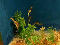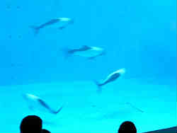 ここの水族館は「順路の無い」水族館という表示が有り、観客は銘々好きなコーナーを勝手に見るということです。構造的には中央から入り、左右に各コーナーが有り(A〜Lという風にアルファベットで表示)、左右の端にイベントコーナーがあります。ここの特筆的なことはラッココーナーを除く水槽と水が非常に綺麗なことです。名古屋港にはやや劣りますが、満足行くものです。右はI(極地の海)のイルカで、左はタツノオトシゴみたいな生き物です。 | ![]() |