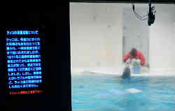 入ってすぐにラッコのエサやりがありましたので、すぐに見に行きました。ここでの唯一の欠点がガラスがかなり汚い(何故か?ここだけです)ことでした。水槽が左右に二つあり、観客もスロープを利用し上下からたくさんの人が見られる方式ですので残念です。ガラスが汚れているので写真もうまく撮れません(汚れたガラスにピントが当たる)。また各コーナーの横の壁にはディスプレイが有りショーの時間表示と現在の時刻、そして関連のある映像が再生されています。この辺が割とリッチな設備で近代的で綺麗な施設しかありません。 | ![]() |