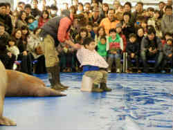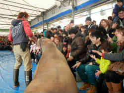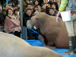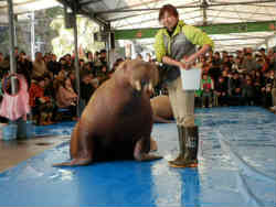 二見でもあったのと同じで輪投げに挑戦した男の子がご褒美にセイウチのチューを受けるというパフォーマンスで、右は歯ブラシ(洗車モップ?)で歯を磨きます。男の子には前掛けを掛けてもらい受けます。終始その進行では男性飼育員がうまく口で演出され、観客も大いに感動しています。途中ハーモニカも吹きます。全部のショーが時間にしておおよそ20分程度で二見を見た後はその大差にびっくりです。 | ![]() |