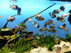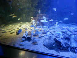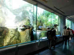 さていよいよ本格的に回ります。右は動物園にいるカピバラ(巨大なネズミ)や鋭い歯のピラニアなどです。ここの水族館の特徴のひとつですが、いわゆる魚影が濃い(魚密度が高い)という展示法です。とにかく小さな水槽(というか中ぐらいになる)に多くの魚が詰め込まれています。 | ![]() |