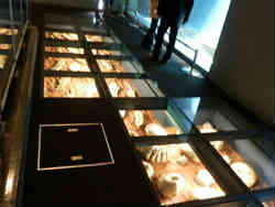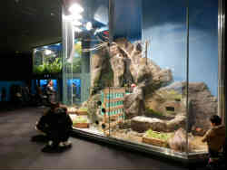 ![]() 右はC(古代の海)のコーナーで足元にはアクリルの板がはめ込み、地球の大地の下には生きている化石のオウムガイやカブトガニなどの化石?が展示しています。前の水槽には生きている化石が泳いでいます。左は屋上から鳥羽の海が見えます。奥は真珠島で手前は養殖の真珠(アコヤガイ)貝でしょうか?。さらに左はG(森の水辺)のカエルコーナーです。 | ![]() |