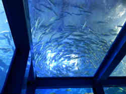 D(コーラルリーフダイビング)コーナーで巨大な水槽をいくつかの方向から見え、特に左は上下左右に魚たちが見られてまるで自分がダイビングをしているかのような水槽があります。左はイワシの群れでは無くおそらくイサギ?かなと思う大きな魚です。 | ![]() |