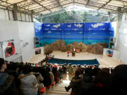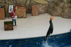 | 内容的にはどこにもあるのと同じですが、右写真にあるイルカショーにある空中のボール(鐘も有り)を水中から飛び出てタッチ(鐘が鳴る)が最後の見物でした。台でのパフォーマンスや輪投げ・プール手前の台に載かって愛想良く移動し手を振りなどの演出です。 | ![]() |