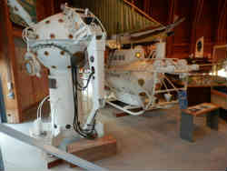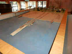 隣には日本の潜水技術の知恵を集めた昔の潜水艇です。その2階には色々な漁法の紹介が有り、左写真は海岸で行う地引き網のジオラマです。多くの人が引っ張った網を最後に魚が入っていて捕るというやりかたです。 | ![]() |