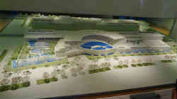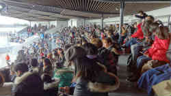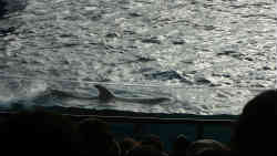 入ってすぐにイルカショーが始まると言うことなので、順路に沿って行くのは良いのですが(他の近道の方法は無い)、多くの観客をすり抜けていかなくてはならず無駄な時間が過ぎていきました。やっとの思いで何とか席を確保し見学となりました。大きさは意外と小さく横30mで奥行き15m程度の舞台(プール)で観客席の方がはるかに大きい物です。後ろには公園が見えています。 | ![]() |