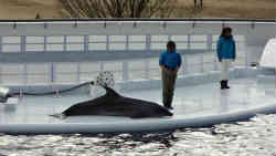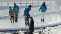 あとで判りますが(時間稼ぎ?)、最初にイルカの生態や形態の紹介として、イルカのヒレや口の中、泳ぎ方や声の発し方などの説明があります。その前にはイルカのジャンプで会場を盛り上げます。全体を見渡すとどこにでもある上部にワイヤーをかけ吊しているボールのようのな物が見あたりません。 | ![]() |