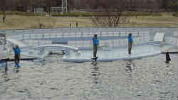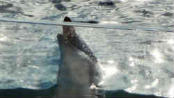 次に観客の子供を指定して前に出させ、イルカのヒレにタッチさせるというパフォーマンスです。これに結構時間をかけています。次に再びイルカのジャンプを数回します。さあ前段階は終わりでいよいよ華やかなジャンプショーが始まるのかと思いきや何と終了です。全部で15分程度?でしかも最初のイルカの紹介と子供のタッチで2/3以上使っています。結局2匹程度のイルカのジャンプの連続と高速で泳ぐシーンのみでした。おそらくまだ調教不足なのでしょうか?。その証拠に次のショーまでの間、練習を繰り返していましたからで、それも座って眺めることが出来ます。そのくせ一端全員出させて完全入れ替え制とうたっていました。 | ![]() |