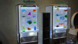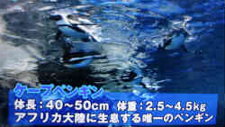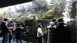 次にペンギンのコーナーです。やはりアシカ・イルカやペンギンは仕草がかわいいので水族館の常連メインです。ここのペンギンも数種類のペンギンが居てます。左は所々にあるモニターで録画した様子を再生しています。 | ![]() |