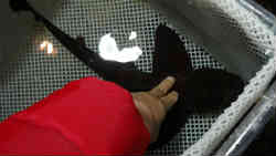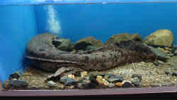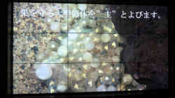 そして一端再入場のサイン(手の甲にスタンプ)をもらい、退場し再入場します。混雑がひどくバックはできなかった。入場するとさっき素通りした箇所をゆっくりと見ていきます。入ってすぐはオオサンショウウオ(国の天然記念物)の展示です。右が卵を孵化させるアルジ(主)と呼ばれるDVDの映像と本物の展示です。しかし狭い場所で大勢の人が見てしかも動かない物だからなかなか写真に撮れません。他にも水槽があるのですが小さな窓(二人前に並ばれると見えない程度)では待ってまで見る気にはなりません。 | ![]() |