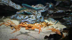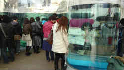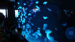 右クラゲに左は魚とカニですが、このようにカニの水槽に大量の魚が入っているのはあまり見かけません。ここの水族館の印象ですが、やたら係員が敷地面積の割には多かったという印象です。混雑していたためか、あるいは裏方も総動員していたためか至る所に居た感があります。 | ![]() |