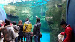 ここの水族館の特徴?なのか、順路が決められていて所々屋外の部分があるのです。通常の都会型の水族館ではないのですが、冬季ではかなり寒いのです。ここは、アザラシの水槽で、色々な種類のアザラシを色々な方向から観察ができます。 | ![]() |