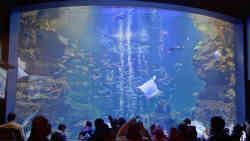 途中ここのメイン?の大水槽です。幅は狭い(6m程度?)ですが割と縦に長いのです。ここの水槽の水は泡が多いのか透き通っていません。汚れは無いのですが写真にあるように白濁して見えます。左は京都水族館の模型の展示です。 | ![]() |