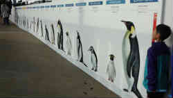 ペンギンの水槽へと向かう途中で壁に多くのペンギンの紹介と実物大の大きさの絵が並んでいます。それを進み飼育水槽ですが、一角に雛を子育て中というのがあり、穴の奥にちらっと見えています。写真ではわからないですね。 | ![]() |