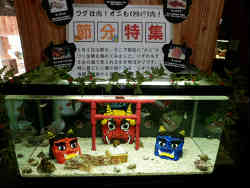 ここの保守管理者は「水族応用生態研究所」と「クラブノアすさみ」という団体です。右は季節の行事として節分がイメージし展示されているコーナーです。左は有名な「さかなくん」の写真でクニマスの紹介やさかなくんも寄付していることがわかります。 | ![]() |