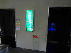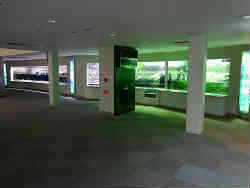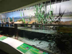 ここはホタルラボで、暗い暗室のような部屋の中にホタルの幼虫が展示され、ホタル生息シーンの図解パノラマです。スイッチを押すと向こうの景色が替わり説明テープが流れて勉強ができます。 | ![]() |