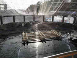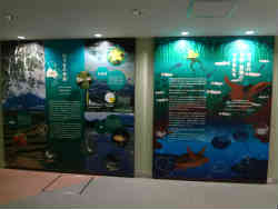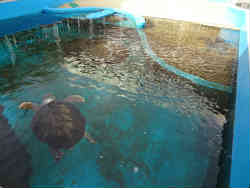 右はプールにいるウミガメで、左ははりまの養殖を再現したプールです。ここには養殖されている(展示?)魚が多くいます。水面には遮光の網を張っています。水中には網で囲み下の窓から見ることが可能です。 | ![]() |