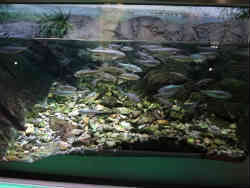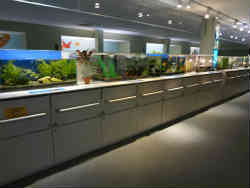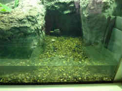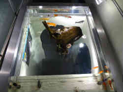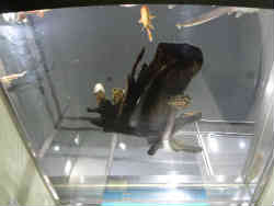 ここは「上から下から水槽」で、上下にアクリル板がはめてあり、魚が腹ばいと上からと見られます。木の下に隠れている魚も下からはしっかり見ることができます。 | ![]() |