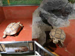 右がケズメリクガメで、飼育員がフンの掃除をしていましたぐらい入場が早かったのです。おそらくまだ見学者は来ないと思っていたのでしょうか?。左はアメンボの行動実験で、グルグル回転できる水槽の中(水面は動かない)にアメンボが入っており、見物客が外側の水槽を手で回すと水槽に沿ってアメンボが一緒に回ります。周りの変化に合わせて行動するのだそうです。 | ![]() |