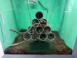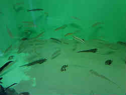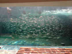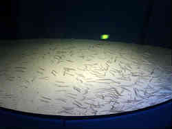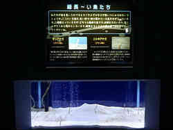 右はアナゴが土管の中にびっしりと入っています。大きなアナゴは入りきれずに外をウロウロ泳いでいます。左はキスが砂底に居ます。水族館ではあまりキスは見ないですね。 | ![]() |