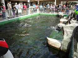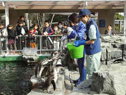 ペンギンたちへのエサやりの時間になり他の小学生達と見学です。ペンギンたちは腕にタグを付けており、その色の組み合わせで識別しておおまかなエサ(アジ)の量を確認して居るみたいです。むこうの女の人はこの水族館のボランティアスタッフの方らしいです。手前の若い女の人が飼育員です。バケツ2杯の結構な量をあげていました。右写真はペンギンは水中でかなり早く泳げるので水中にエサ巻いて捕食するシーンです。ペンギンには身体に模様がありますが子供にはないそうです。 | ![]() |