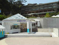 そしてクライマックスには訓練されたカマイルカが出てきて水槽の周りをグルグル周回します。実際の水面は自分の身長よりも高い位置で海水がオーバーフローされていますので、雰囲気はちょうどアクアラングで水中に居る錯覚をおこさせます。最深部では目の前には透明筒にて海中状態が見え、足元には海水が流れ込んでいる波が見て取れます。おおよそ全体で10分程度でしょうか?。これで500円は高いか安いかは個人次第ですが、まあこのような装置はここだけでしょうか?。 | ![]() |