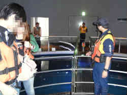 次のコントとしては「沿岸警備隊」(まるで海猿?)と称して、アシカ達に芸を仕込みます。観客も駆り出されて(事前に希望者を募ったのだが希望者が無いので本番で無理矢理)、バランス対決をします。もちろんアシカが勝ちです。アシカは鼻の上で観客は手の上で。 | ![]() |