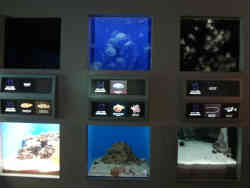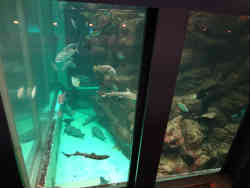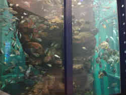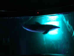 ここはあの日本一縦長の水槽です。上からと横からと底へと階段に沿って色々の場面から見ることができます。右は透明の壁面に吸い付くコバンザメで左は中間部です。壁は結構綺麗ですが、海水は酸素の泡が見えていますのでやや濁って見えますが綺麗です。 | ![]() |