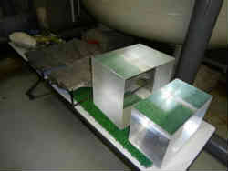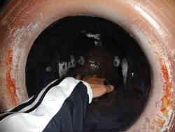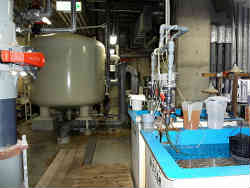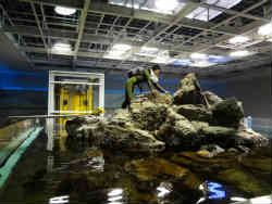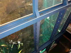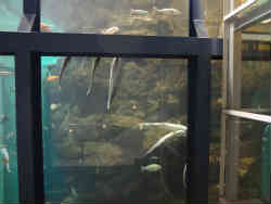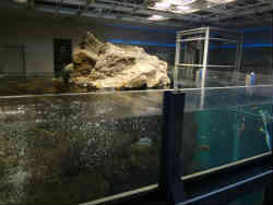 次にオプションとして「バックヤードツアー」(1000円)に参加します。このふたつは時間設定があるので続けての催し物となります。係員に案内して貰えます。まず水槽のメインである「シーズー」の縦長の水槽です。この水槽は日本一深い水槽で水深12mを誇ります。幅自体はあまり大きくないですが三角形をしています。また上は解放されており、上端は自分の目線程度です。水槽自体は鉄骨で補強されています。左写真の左下に黄色いのは女性のダイバーで透明の壁を磨いています。 | ![]() |