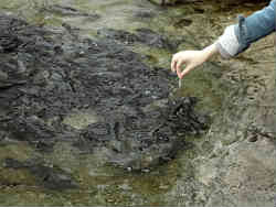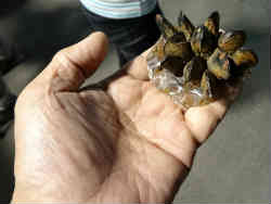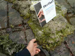 説明によるとまず岩は作り物で上に人が乗るような場所ではコンクリートで作り着色しています。軽くしなければならない箇所にはFRPで作っています。どちらも本物の岩から型を作って製作していますので本物そっくりです。そして貝であるフジツボや珊瑚礁も偽物らしいのです。珊瑚礁は一部本物もあるそうですが、大半は偽物です。理由はフジツボ(浸け置きの船の底に付く)などは海水を濾過するパイプの中に付着するので飼育しないそうです。手に持っている右写真のフジツボも偽物です。岩の上に居るのは先ほどの女性ダイバーの上陸シーンです。 | ![]() |