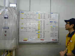 右写真のアクリル片は裏に展示している物(このバックヤード用)で、この水槽の一番上部はおおよそ6.5cm幅で下に行くほど厚くなり最深部は25cm程になるそうです。当然アクリルは強度が有り、曲がりにも強くなおかつ透明度も高いそうです。現に水槽最上部のアクリルは水圧で縦から見ると曲がっているのがわかります。左写真はこの水族館の生き物たちのエサの配合量と時間帯です。いわゆる給食の献立と時間帯です。 | ![]() |