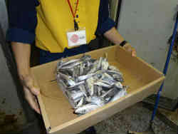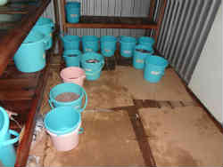海獣のエサはすべて冷凍品を使用しています。理由は安価で常に提供されるし、病原菌や寄生虫なども冷凍することで死滅するそうです。よって解凍しなければなりません。大きな冷凍庫と冷蔵庫にも案内入室することができました。右写真は冷蔵庫に置いてある解凍されたエサでバケツに名前が書いてあります。当然それぞれエサの種類や量と体調にでも変化します。そして必要なら獣医指導の下、サプリメントや薬をエサの中に挿入します。薬は基本的に人間用のを使用しますが、体重が違うので量がとても多いそうです。 | ![]() |